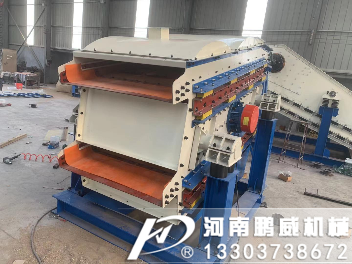 沸騰篩篩面是用氨基甲酸乙酯制造,堅韌而耐磨,在運動時能產生很高的加速度,一般是重力加速度的30~50倍,使粘性很強和容易堵孔的粉狀物料,能充分透篩。其寬度為250mm,然后伸直,其伸縮量為24mm,是曲軸偏心距的4倍。沸騰篩的結構,外側篩框和內側篩框,借助于中間導向彈簧板,分別安裝在機架上,氨基甲酸乙酯篩面安裝于篩框的橫板上,橫板相互交錯安裝。內外兩個篩框,由曲軸傳動作相對振動時,橫板也隨之一起振動,實現篩面的沸騰運動。采用雙組側板電機激振器由偏心塊同步旋轉共振帶動彈性聚氨酯篩板產生波浪弛張振動的圓彈躍運動和直線彈躍運動,篩面傾角一般為15-25°篩板由兩端活動梁固定,配合剪切彈簧和板簧產生高振幅振動達到固定橫梁和活動橫梁對篩網的慣性力矩不斷地張弛形成一凹一凸的波浪效果達到物料良好的松散流動性同時獲得有效的物料彈躍篩分,實現篩分精度,篩分產量和防堵網的效果。