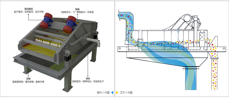 1、篩機整體采用水平安裝,篩網(wǎng)傾斜安裝,可以保證強制脫水;